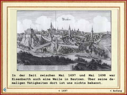 In der Zeit zwischen Mai 1697 und Mai 1698 war Eisenbarth auch eine Weile in Bautzen. Über seine da- maligen Tätigkeiten dort ist uns nichts bekannt. < 1697 < Anfang