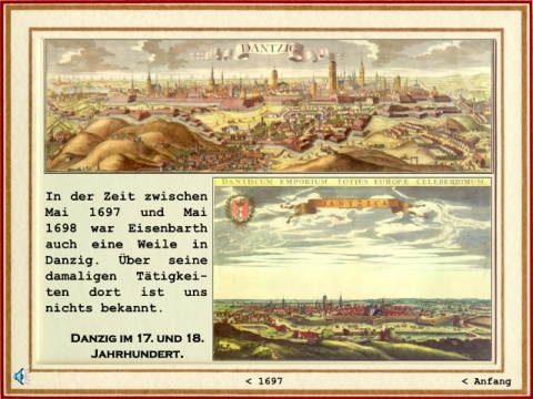 In der Zeit zwischen Mai 1697 und Mai 1698 war Eisenbarth auch eine Weile in Danzig. Über seine damaligen Tätigkei- ten dort ist uns nichts bekannt. Danzig im 17. und 18. Jahrhundert. < 1697 < Anfang