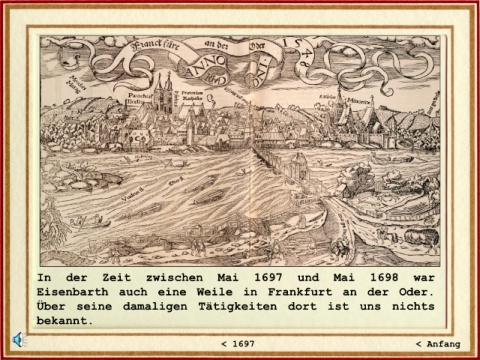 In der Zeit zwischen Mai 1697 und Mai 1698 war Eisenbarth auch eine Weile in Frankfurt an der Oder. Über seine damaligen Tätigkeiten dort ist uns nichts bekannt. < 1697 < Anfang
