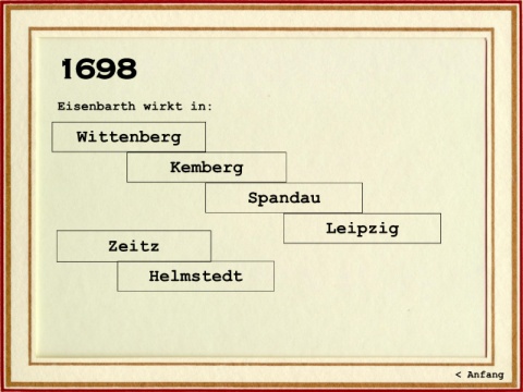 1698 Eisenbarth wirkt in: Wittenberg Kemberg Spandau Leipzig Zeitz Helmstedt < Anfang