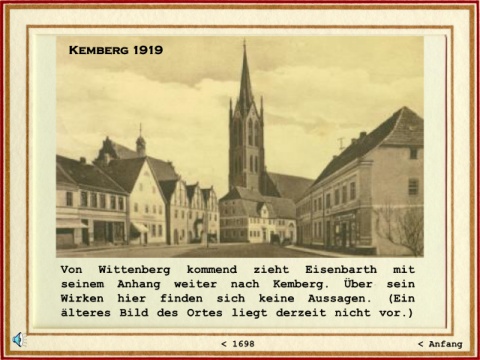 Kemberg 1919 Von Wittenberg kommend zieht Eisenbarth mit seinem Anhang weiter nach Kemberg. Über sein Wirken hier finden sich keine Aussagen. (Ein älteres Bild des Ortes liegt derzeit nicht vor.) < 1698 < Anfang