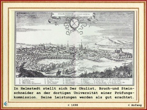 In Helmstedt stellt sich Der Okulist, Bruch-und Stein- schneider an der dortigen Universität einer Prüfungs- kommission. Seine Leistungen werden als gut erachtet. < 1698 < Anfang