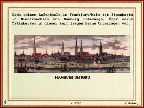 Nach seinem Aufenthalt in Frankfurt/Main ist Eisenbarth in Niedersachsen und Hamburg unterwegs. Über seine Tätigkeiten in dieser Zeit liegen keine Unterlagen vor. Hamburg um1690 < 1700 < Anfang