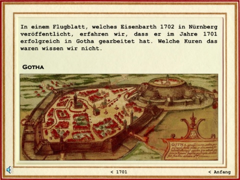 In einem Flugblatt, welches Eisenbarth 1702 in Nürnberg veröffentlicht, erfahren wir, dass er im Jahre 1701 erfolgreich in Gotha gearbeitet hat. Welche Kuren das waren wissen wir nicht. Gotha < 1701 < Anfang