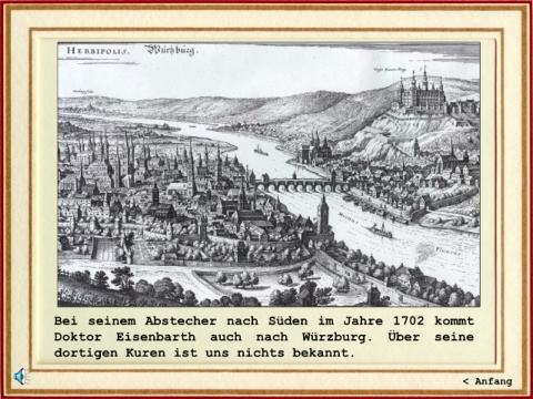 Bei seinem Abstecher nach Süden im Jahre 1702 kommt Doktor Eisenbarth auch nach Würzburg. Über seine dortigen Kuren ist uns nichts bekannt. < Anfang