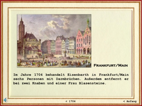 Frankfurt/Main Im Jahre 1704 behandelt Eisenbarth in Frankfurt/Main sechs Personen mit Darmbrüchen. Außerdem entfernt er bei zwei Knaben und einer Frau Blasensteine. < 1704 < Anfang< Anfang