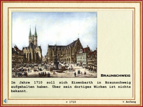 Braunschweig Im Jahre 1710 soll sich Eisenbarth in Braunschweig aufgehalten haben. Über sein dortiges Wirken ist nichts bekannt. < 1710 < Anfang