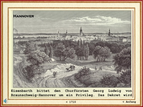 Hannover Eisenbarth bittet den Churfürsten Georg Ludwig von Braunschweig-Hannover um ein Privileg. Das Dekret wird < 1710 < Anfang