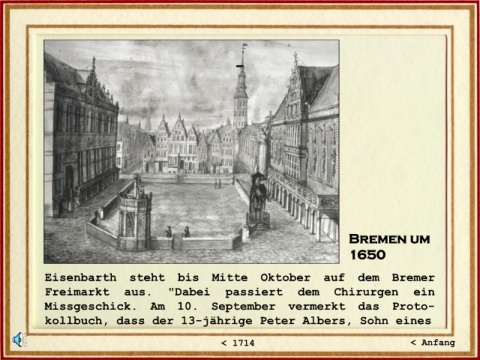 - Bremen um 1650 Eisenbarth steht bis Mitte Oktober auf dem Bremer Freimarkt aus. "Dabei passiert dem Chirurgen ein Missgeschick. Am 10. September vermerkt das Proto- kollbuch, dass der 13-jährige Peter Albers, Sohn eines < 1714 < Anfang