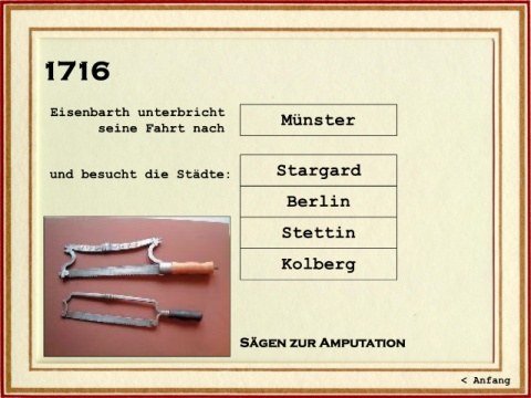 1716 Eisenbarth unterbricht Münster seine Fahrt nach und besucht die Städte: Stargard Berlin Stettin Kolberg Sägen zur Amputation < Anfang