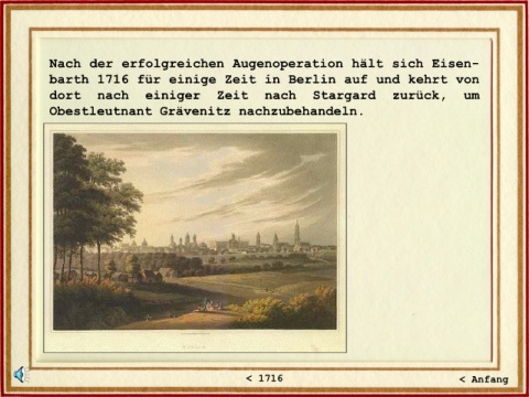 Nach der erfolgreichen Augenoperation hält sich Eisen- barth 1716 für einige Zeit in Berlin auf und kehrt von dort nach einiger Zeit nach Stargard zurück, um Obestleutnant Grävenitz nachzubehandeln. < 1716 < Anfang