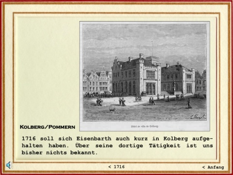 Kolberg Kolberg/Pommern 1716 soll sich Eisenbarth auch kurz in Kolberg aufge- halten haben. Über seine dortige Tätigkeit ist uns bisher nichts bekannt. < 1716 < Anfang