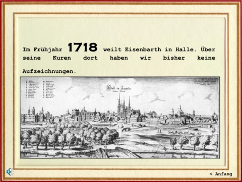 Im Frühjahr 1718 weilt Eisenbarth in Halle. Über seine Kuren dort haben wir bisher keine Aufzeichnungen. < Anfang