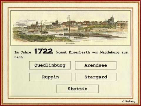 Im Jahre 1722 kommt Eisenbarth von Magdeburg aus nach: Quedlinburg Arendsee Ruppin Stargard Stettin < Anfang