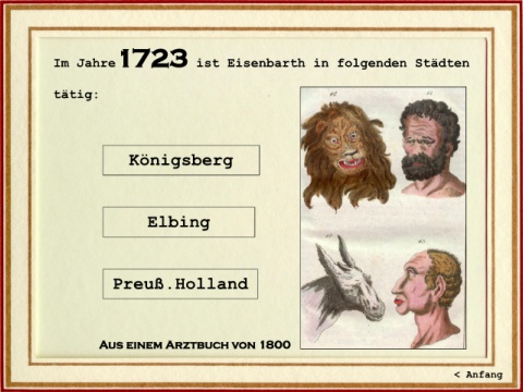 Im Jahre1723 ist Eisenbarth in folgenden Städten tätig: Königsberg Elbing Preuß.Holland Aus einem Arztbuch von 1800 < Anfang