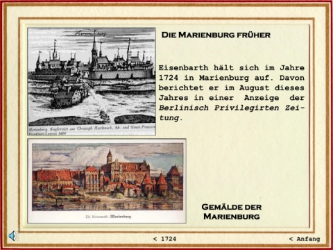 Die Marienburg früher Eisenbarth hält sich im Jahre 1724 in Marienburg auf. Davon berichtet er im August dieses Jahres in einer Anzeige der Berlinisch Privilegirten Zei- tung. Gemälde der Marienburg < 1724 < Anfang