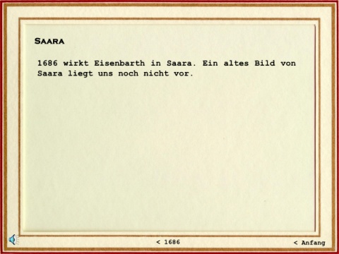 Saara 1686 wirkt Eisenbarth in Saara. Ein altes Bild von Saara liegt uns noch nicht vor. < 1686 < Anfang
