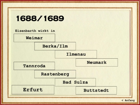 1688/1689 Eisenbarth wirkt in Weimar Berka/Ilm Ilmenau Neumark Tannroda Rastenberg Bad Sulza Erfurt Buttstedt < Anfang