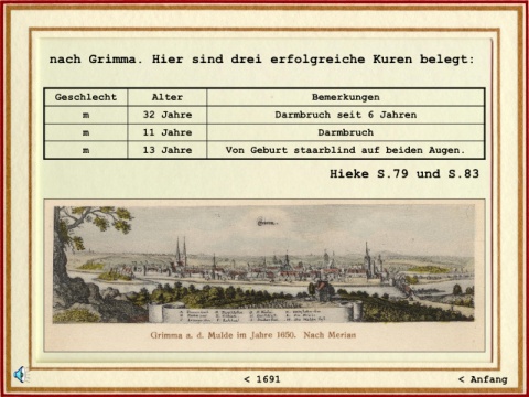 nach Grimma. Hier sind drei erfolgreiche Kuren belegt: Geschlecht Alter Bemerkungen m 32 Jahre Darmbruch seit 6 Jahren m 11 Jahre Darmbruch m 13 Jahre Von Geburt staarblind auf beiden Augen. Hieke S.79 und S.83 < 1691 < Anfang