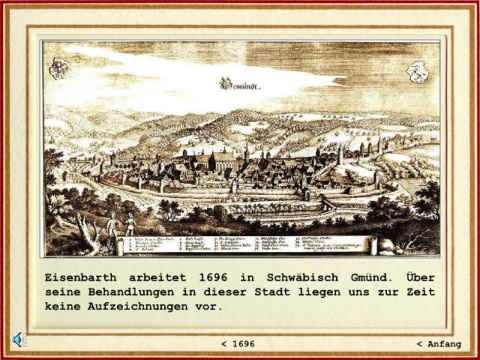 Eisenbarth arbeitet 1696 in Schwäbisch Gmünd. Über seine Behandlungen in dieser Stadt liegen uns zur Zeit keine Aufzeichnungen vor. < 1696 < Anfang